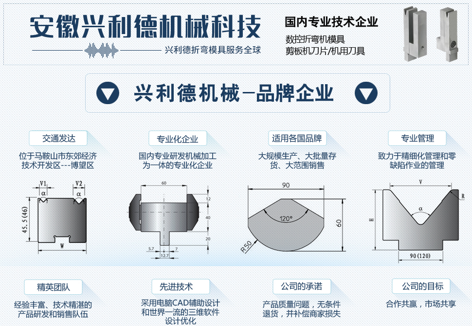 安徽興利德機械科技有限公司(簡稱興利德公司)成立于2008年, 位于馬鞍山市東郊經濟技術開發區---博望區,是一家國內專業,研發 生產制造數控折彎機模具、剪板機刀片、等機用刀具及機械 加工為一體的專業化企業。產品適用于各國品牌設備 ,如, AMADA(阿姆達 )、KOMATS (小松)、LVD (比利時 )、BEYELER(貝勒) 、上海ACL、亞威、揚力、金方圓等, 經過近幾年的快速發展,現已形成大規模生產、大批量存貨、大范圍銷售的良好局勢,除廣泛供應國內市場外,還隨配套機床一同銷往歐洲、美洲、東南亞等地。 興利德公司用現代企業的管理方法,致力于精細化管理和零缺陷作業的管理。立足于產品的質量管理,以其優秀的品質,新穎的設計,合理的價格,完善的售后服務贏得了廣大中外客戶的一致好評。 公司有一支經驗豐富、技術精湛的產品研發和銷售隊伍,采用電腦CAD輔助設計和三維SolidWorks軟...更多>